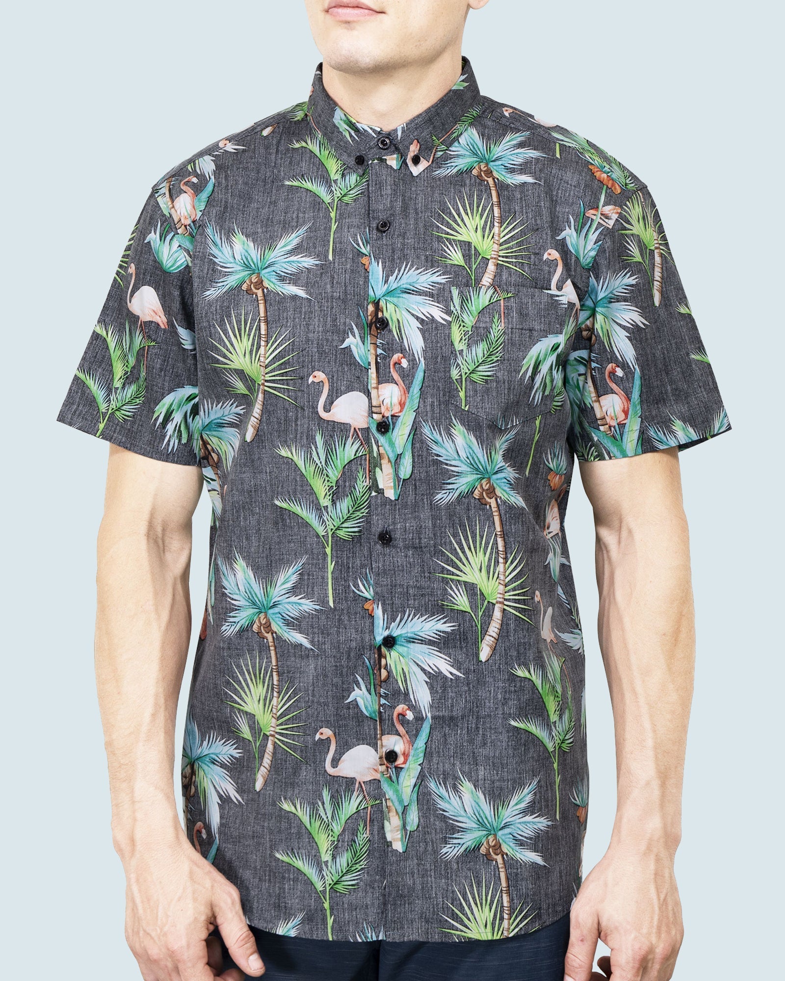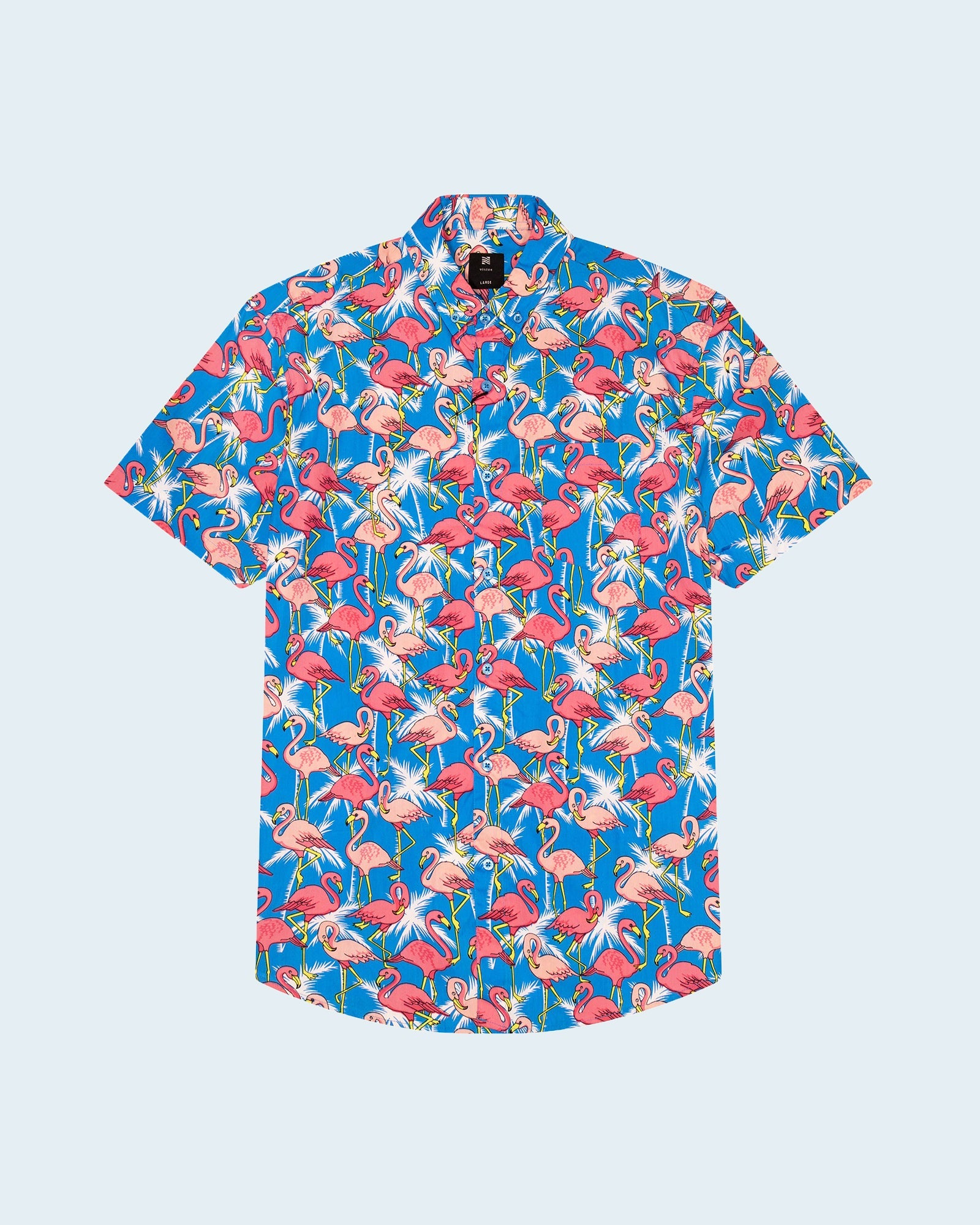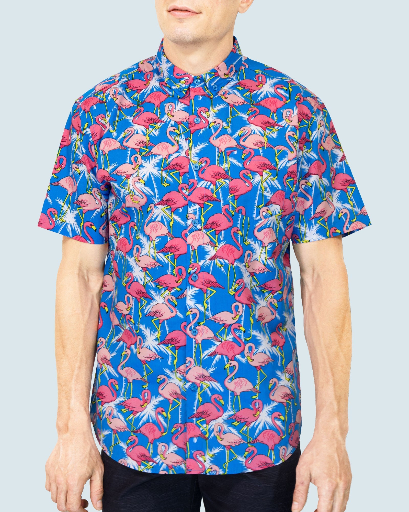 Mens Button Down Shirts - Novelty Prints (Flamingo Palm - Turquoise) - visive