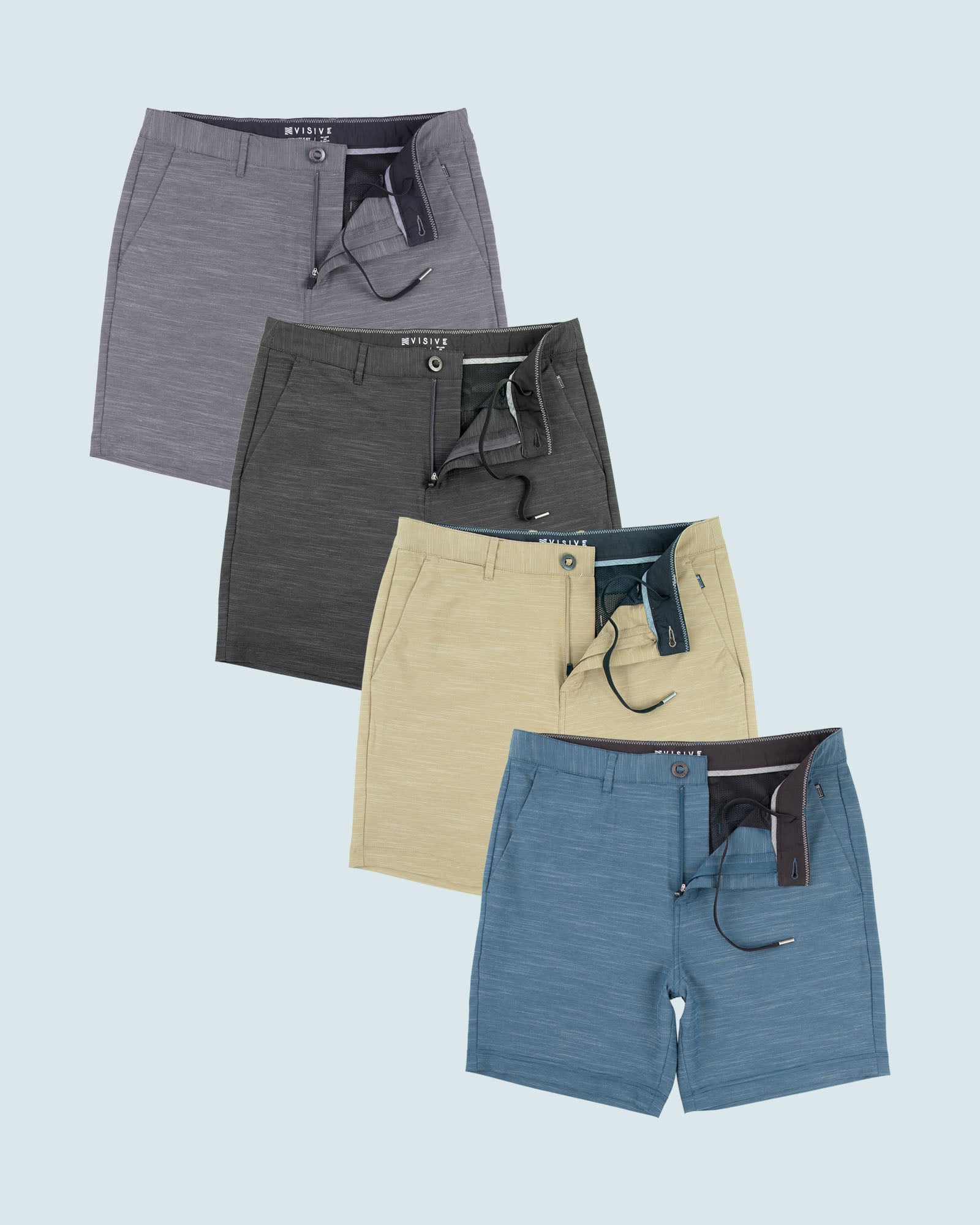 The All In One Men's Hybrid Shorts - Slub Navy by Visive offer sleek style and superior functionality for every occasion. Crafted from 72% Polyester, 20% Cotton & 8% Spandex, these shorts are perfect for both active and casual wear. These men's hybrid shorts deliver comfort, durability, and versatility.
