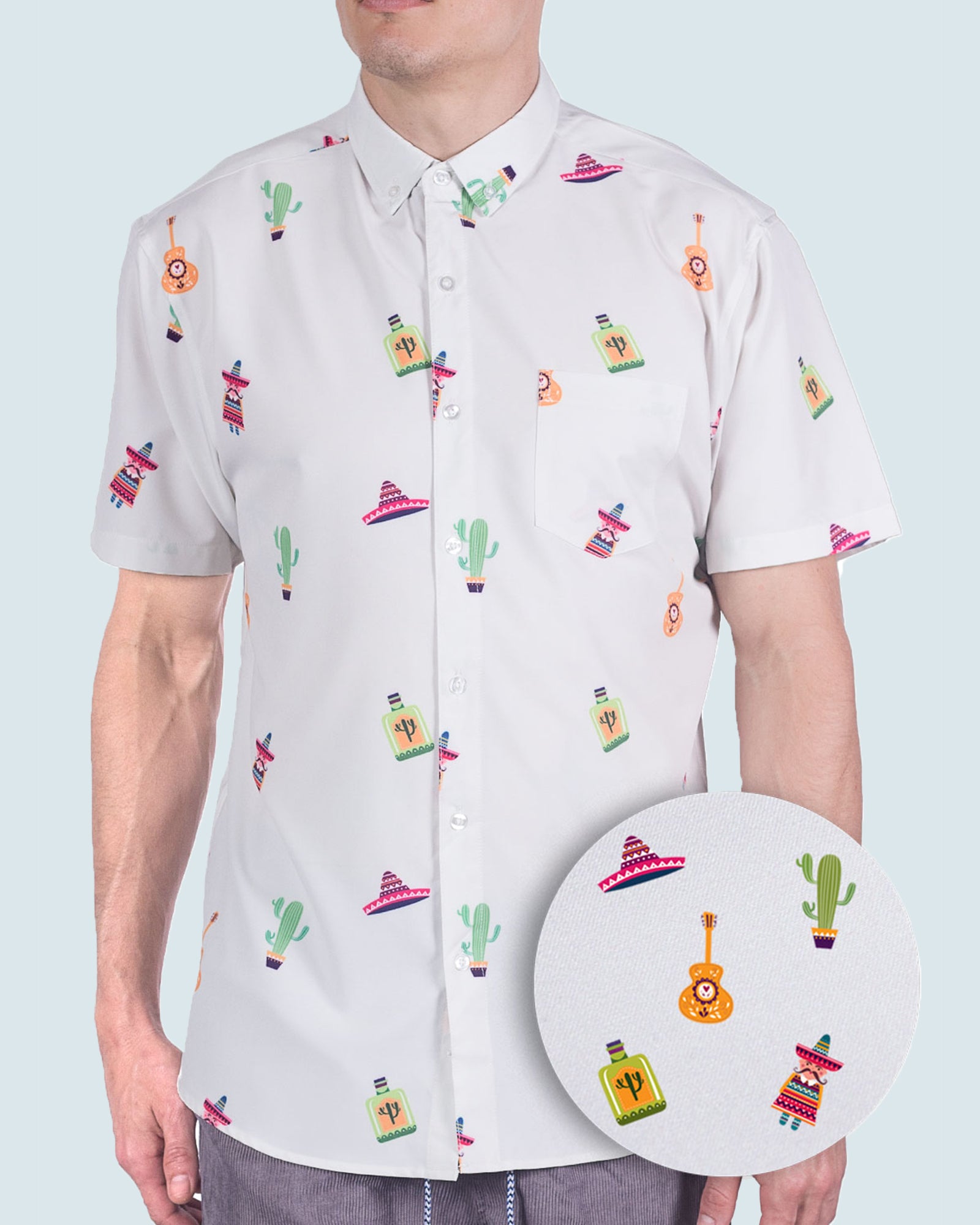 Celebrate every occasion in style with this Fiesta button down shirt, featuring playful sombreros, cacti, guitars, and margaritas on a sleek black background. Made from a premium blend of 90% polyester and 10% spandex, this shirt offers stretch, breathability, and a lightweight feel, ensuring all-day comfort. Its short sleeves and vibrant print make it perfect for summer events, casual outings, or themed parties.