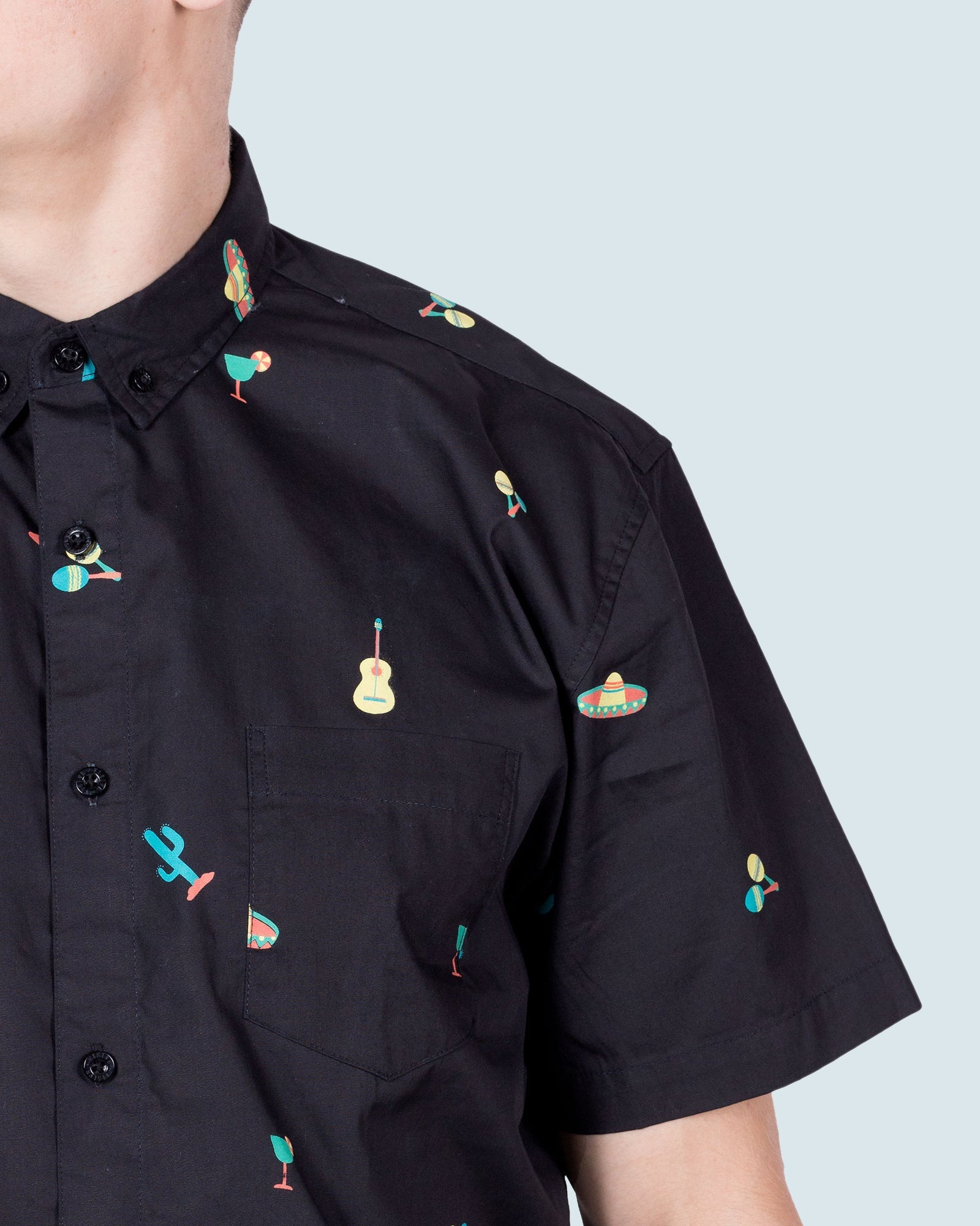 Celebrate every occasion in style with this Fiesta button down shirt, featuring playful sombreros, cacti, guitars, and margaritas on a sleek black background. Made from a premium blend of 90% polyester and 10% spandex, this shirt offers stretch, breathability, and a lightweight feel, ensuring all-day comfort. Its short sleeves and vibrant print make it perfect for summer events, casual outings, or themed parties.