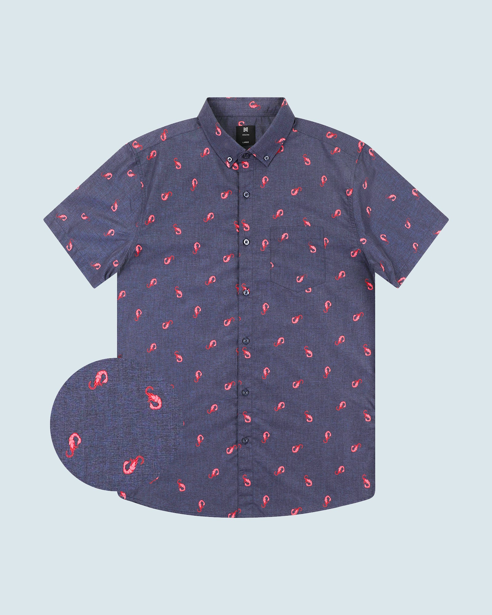 Add a touch of seaside charm to your wardrobe with this Shrimp button down shirt, featuring a playful shrimp print on a deep navy background. Crafted from a premium blend of 55% polyester and 45% cotton, this shirt is lightweight, breathable, and perfect for keeping cool and comfortable all day. Its relaxed fit and short-sleeve design make it ideal for warm weather, whether you're enjoying a casual outing or a summer gathering.